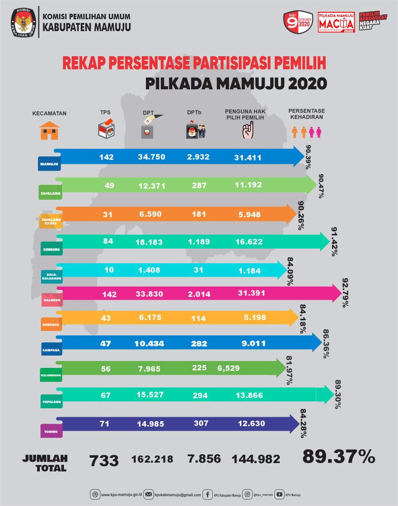 Dari 11 kecamatan, Kecamatan Kalukku jadi penyumbang angka partisipasi kehadiran pemilih tertinggi dengan 92,79 Persen. Disusul Kecamatan Tapalang dengan persentase 90,47 Persen. Kecamatan Kalumpang jadi wilayah dengan persentase penyumbang angka partisipasi terendah dengan 81,97 Persen.