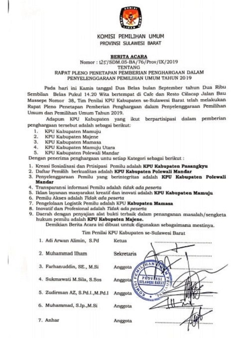 KPU Mamuju menyisihkan KPU Majene, Mamasa, Mamuju Utara dan KPU Polewali Mandar yang ikut serta pada pemberian penghargaan dalam penyelenggaraan Pemilu tahun 2019 yang dilaksanakan KPU provinsi Sulawesi Barat.